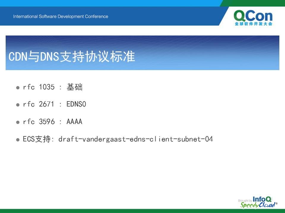 RFC 1035 是87年的协议,最后是ECS。一个月前ECS出了04版,大家会发现04版和03版之间有少量的修饰语变化,意味着不久以后ECS将成为一个真正的DNS协议,现在做CDN如果不支持ECS就落伍了。BIND是全球使用最广的DNS服务,一年前它的开发版已支持ECS。