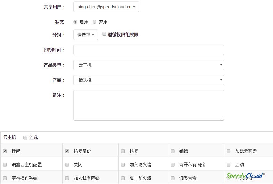 3.权限组。设定产品使用操作权限,点击创建进入产品权限组,填写权限组信息,输入组名称和备注,状态有启用和禁用,可快速切换。产品使用操作可全选,可部分选择,如全选云主机操作,或选择云主机恢复备份、调整带宽等几项操作。